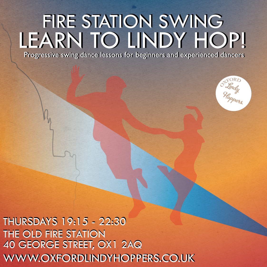 Learn swing dancing with Oxford Lindy Hoppers! Fire Station Swing is our main teaching night on Thursday evenings at the Old Fire Station. It is an inclusive and fun series of progressive classes in ten-week blocks designed to help you see tangible improvements in the joyous and expressive dance of Lindy Hop, Charleston and related authentic jazz dances that originated in African American communities at the height of the Swing Era in the 20s, 30s, and 40s and is a global phenomenon! Anyone from absolute beginners to more seasoned dancers will find a level suitable for them.